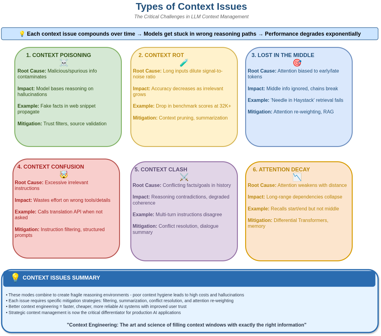 LLMs don’t degrade randomly, they fail in predictable, diagnosable ways tied directly to context quality. In real enterprise workloads, six core context failures repeatedly appear: