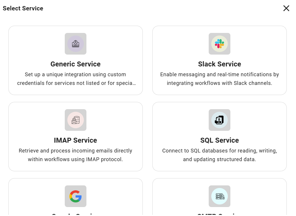 Choose the service you wish to connect to (e.g., IMAP Service, Amazon Web Service, Google Service).