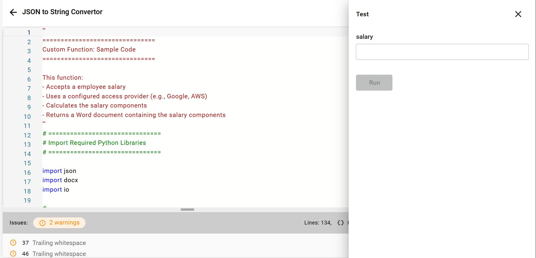 Custom Functions support a curated set of Python libraries for data processing, cloud integration, and business logic implementation. These libraries are pre-installed and ready to use—simply import them using standard Python syntax at the beginning of your function code (e.g., import pandas as pd).