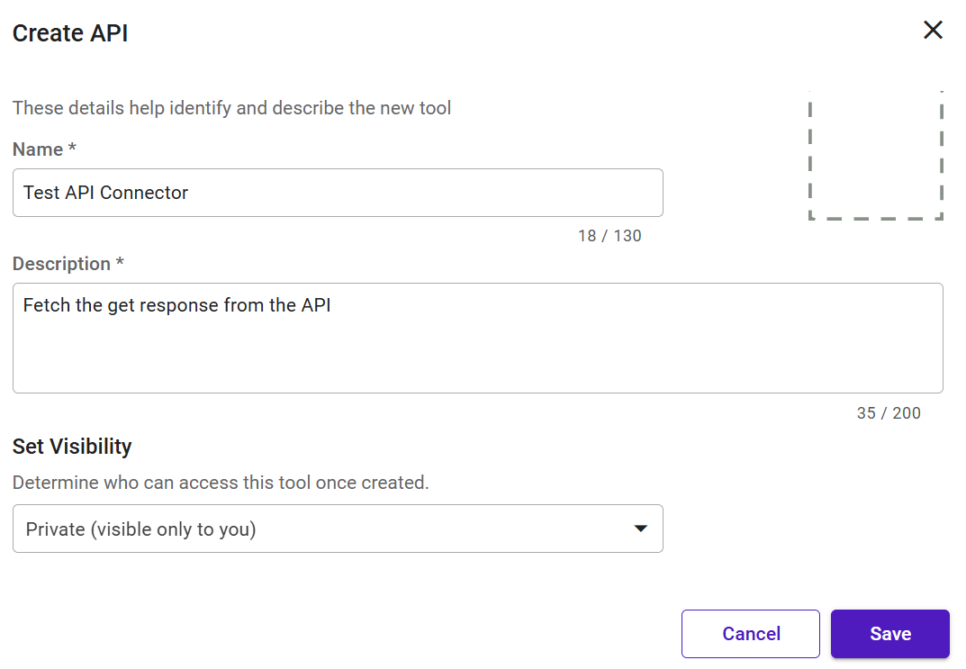 Enter Tool Details: Provide a Name and Description for your API tool.