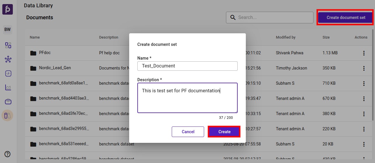 - Click Create to finalize the new document set