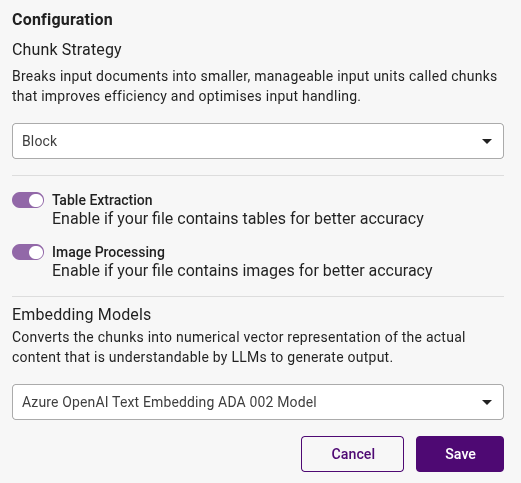- Block: Select this option to chunk files by logical blocks. This is ideal for files with diverse sections or topics where each block represents a distinct segment requiring individual processing