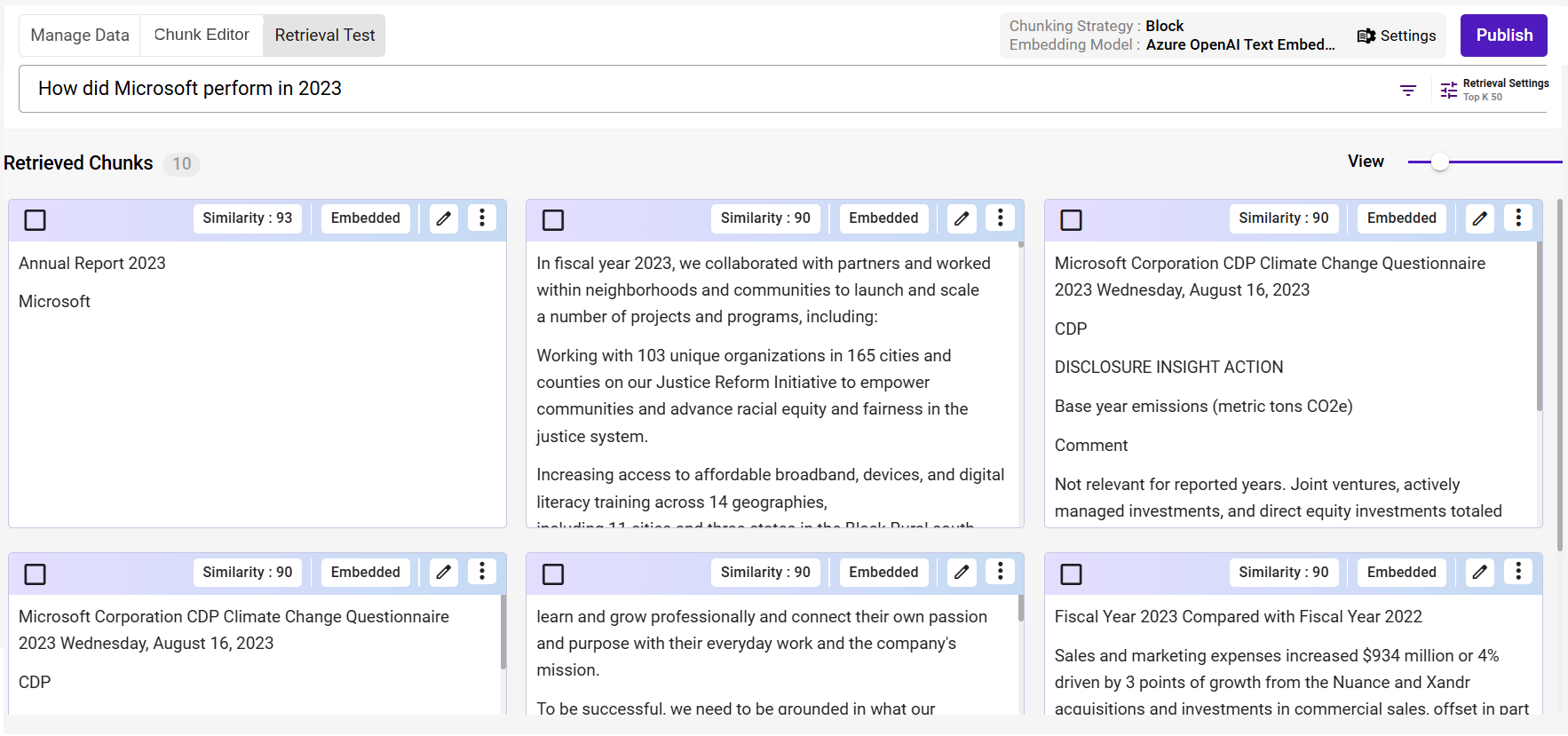 - In the Search bar, enter your query and press Enter. The system will display chunks of information relevant to your query