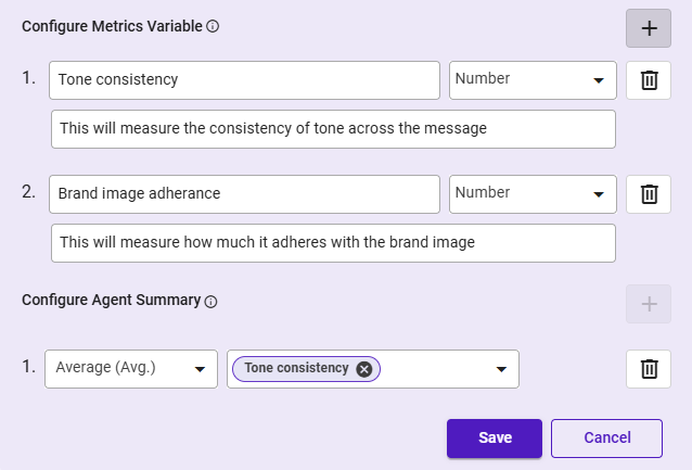 Note: Only Number and Boolean metric variables will be available for adding in score aggregations (Agent Summary). Average can be aggregated for the Number data type, and ‘Count of’ can be aggregated for the Boolean data type